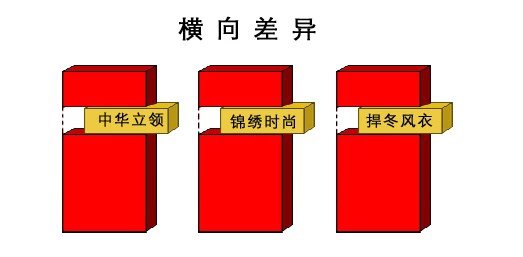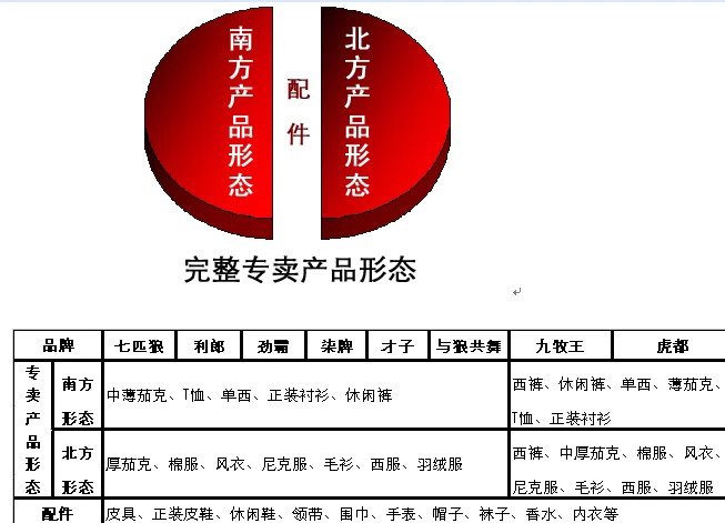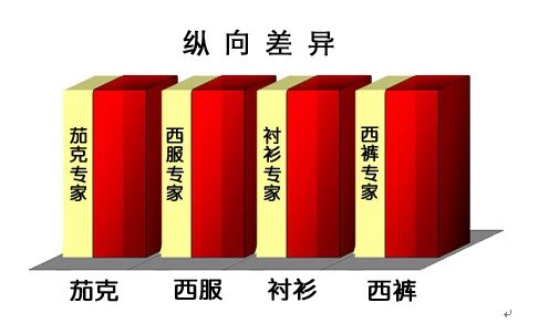 1、纵向差异理念:茄克专家、西服专家、衬衫专家、T恤专家、西裤专家、西裤标准