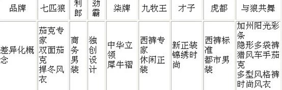 福建男装对产品差异化概念的应用非常活跃,列表如下: