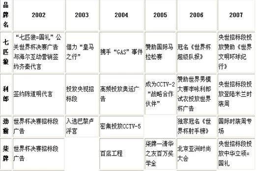 从2002年开始,当浙江的商务正装企业忙于主业之外的投资时,福建的男装开始在高端的媒体CCTV频频发力。这一年,中国队首次打入足球世界杯决赛,柒牌、劲霸、七匹狼在决赛阶段的广告赚足了眼球,品牌知名度直线升位;2004年,利郎以平均每天40多频次豪赌雅典奥运会广告获得成功。除了借力大型体育事件之外,利郎、才子、虎都、七匹狼、柒牌等选择在CCTV-1黄金竞标时段作高端投放,劲霸等选择在CCTV-5作密集投放都起到良好的效果。这些高端高频次的投放对于采取代理制的福建男装来说是非常有效的,不仅迅速完成了总部和区域的招商,也全面拉升了终端的销售力!可谓“振臂一呼天下应”!